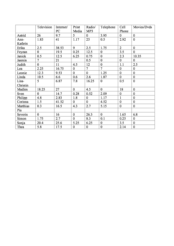 • The Television apparently keeps on loosing its influence. Most of the students watch TV less than ten hours per week. Movies are mostly watched via Internet or computer via DVD.